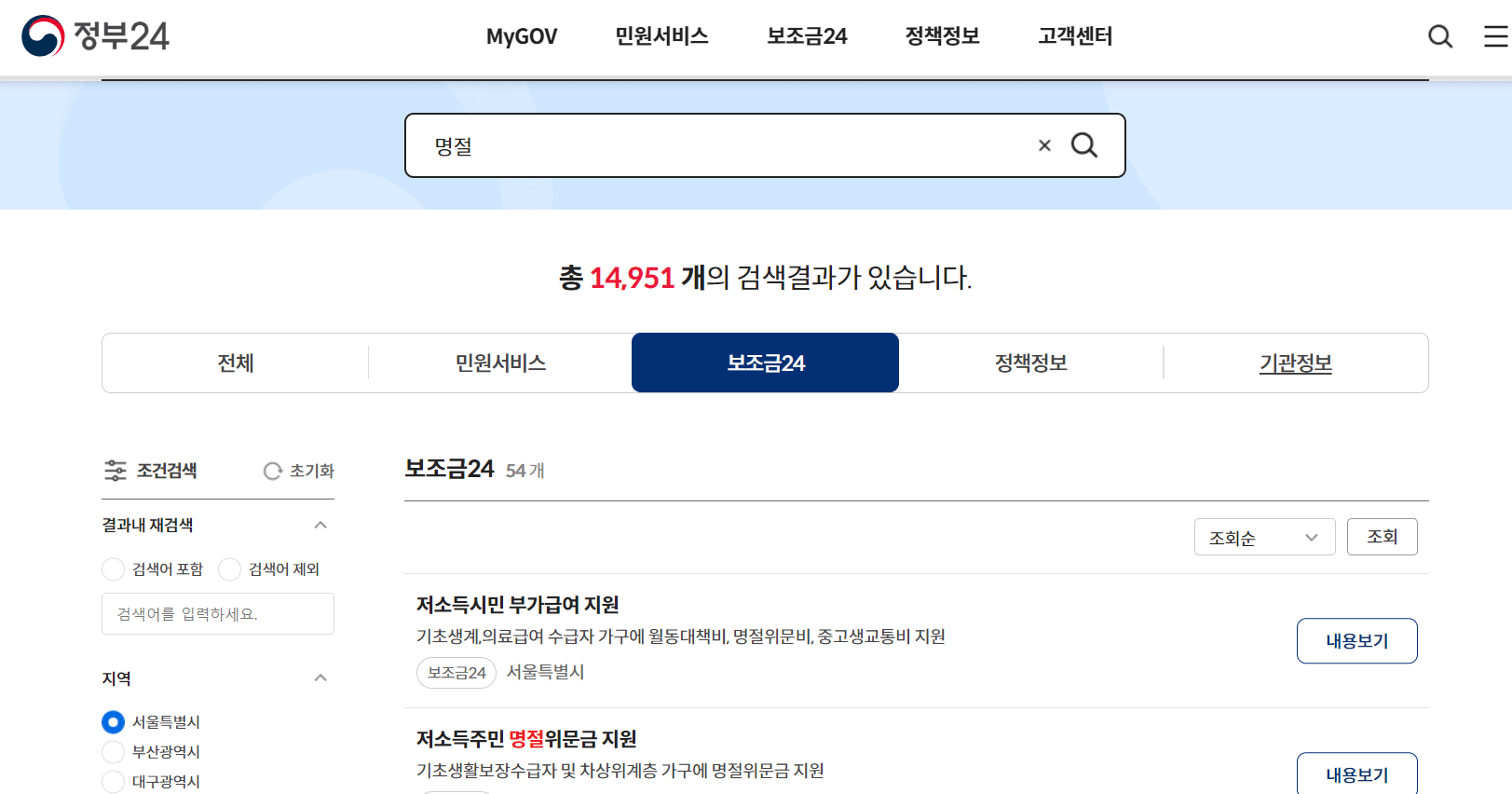 ※ 정부 24에 거주하는 지역의 명절위로금, 명절 지원금, 명절위문금에 대한 정보가 없는 경우 아직 해당내용을 올리지 않아 검색되지 않는 경우도 있스므로 꼭 관할 행정복지센테에 문의하여 명절위로금, 명절 지원금, 명절위문금을 확인하여 주시기 바랍니다.