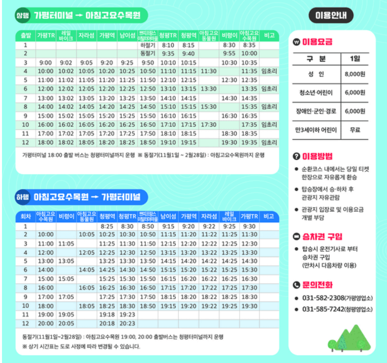 가평시티투어버스란? 가평 내 유명관광지를 순환하는 버스로, 1일권(성인 8,000원)을 구매하면