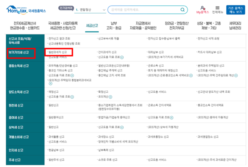 일반과세자의 경우 정기 신고를 선택하신 후 기본 정보 입력 화면에서