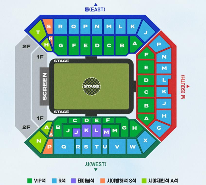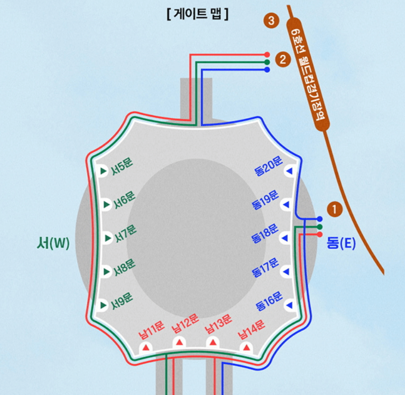 - 예매한 구역별 색상이 다른 디지털 카드 티켓을 제공합니다. 아래 게이트 맵을 참고하시어 본인이 수령한 디지털 카드 티켓의 색상과 동일한 색상의 게이트 안내표지를 따라 이동하면 쉽고 빠르게 좌석을 찾을 수 있습니다.