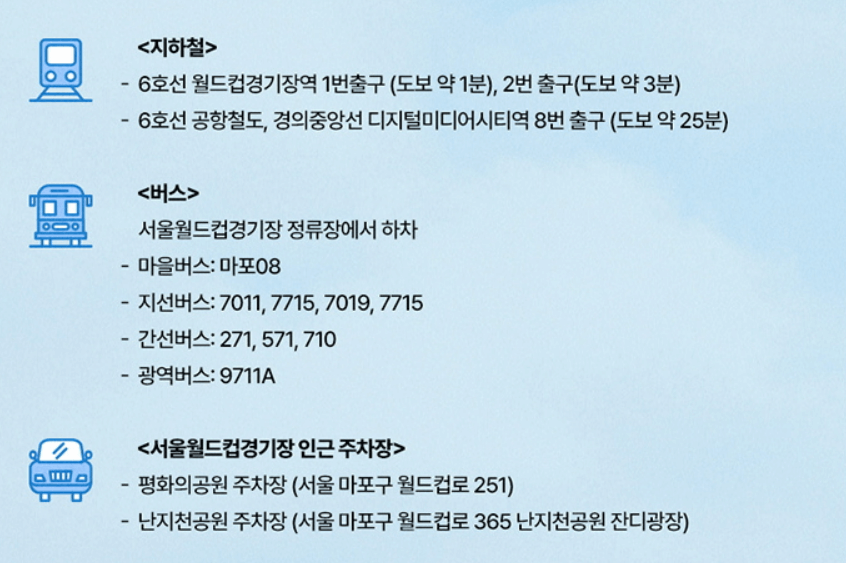 -공연 당일 서울 월드컵 경기장 이용이 불가합니다. 인근 주차장 역시 일찍 반차가 예상되므로 가급적 대중교통을 이용해 주시기 바랍니다. (휠체어(장애인석) 관객 분들은 서울 월드컵 경기장내에 위치한 장애인 주차공간 사용이 가능합니다.)